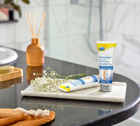 Verwöhne Deine Füsse und integriere Scholl’s ExpertCare Fusscreme für trockene Haut in deine nächtliche Hautpflegeroutine.